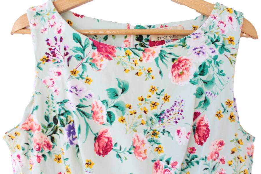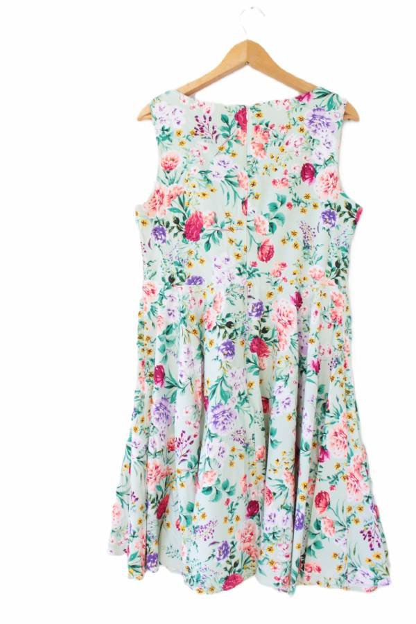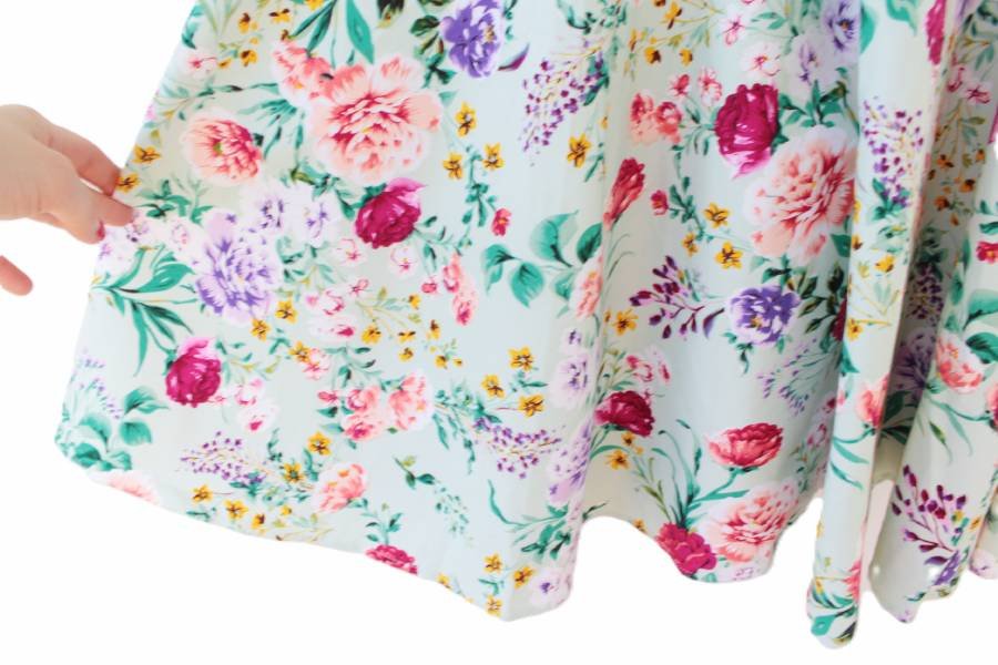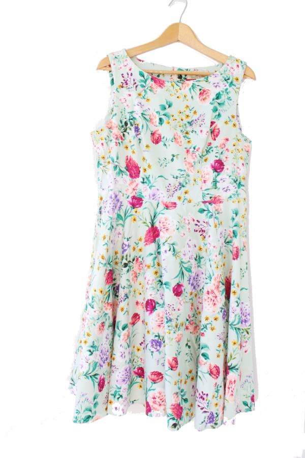 Sukienka vintage z motywem kwiatowym. Ładnie podkreśla sylwetkę, rozszerzana ku dołowi. Z tyłu długi suwak.
