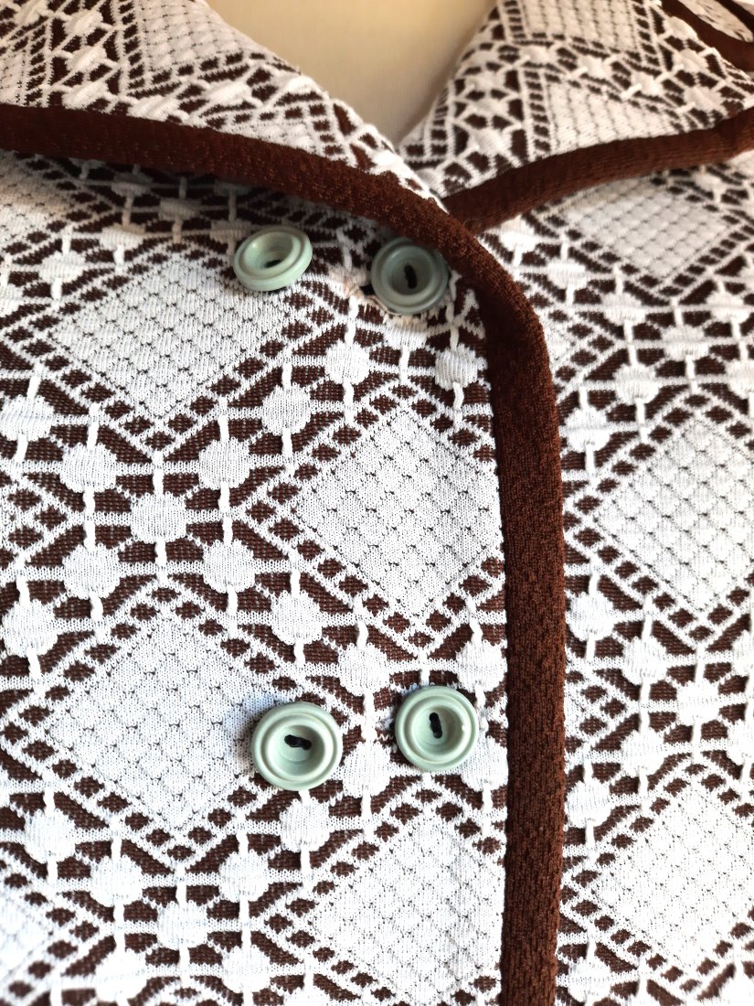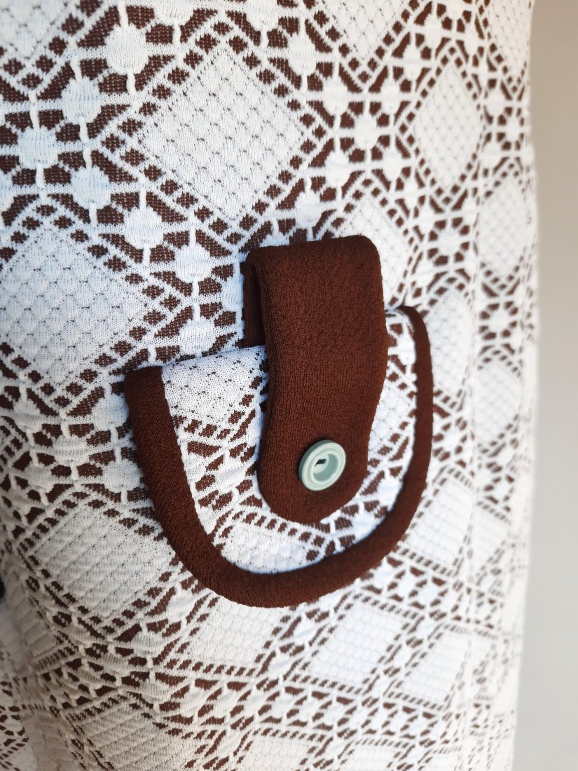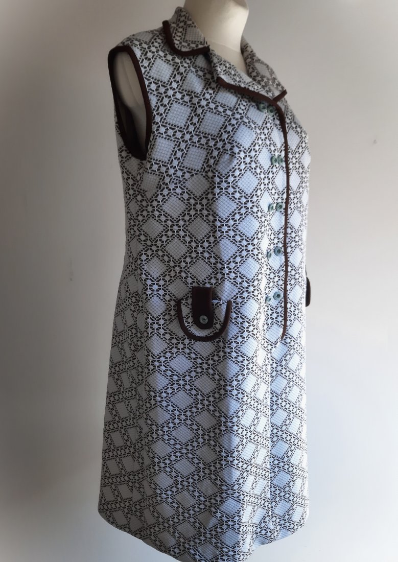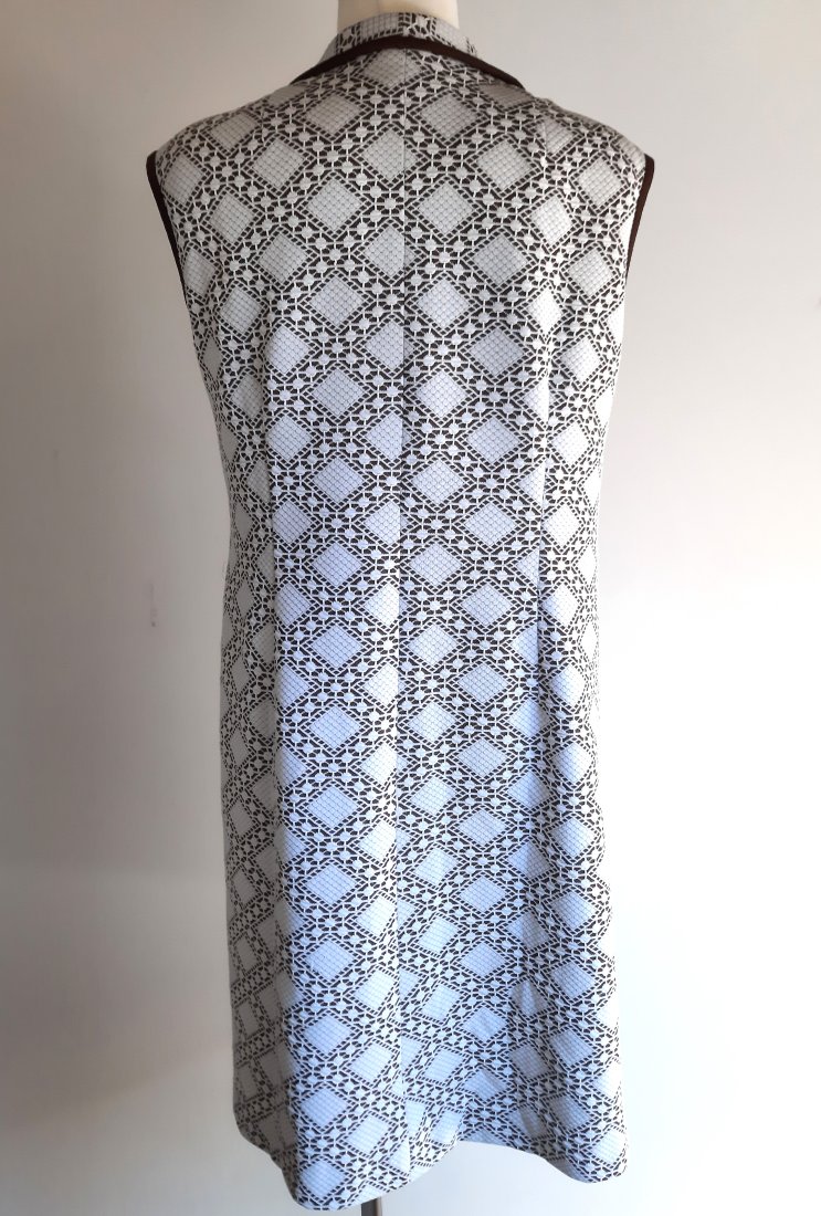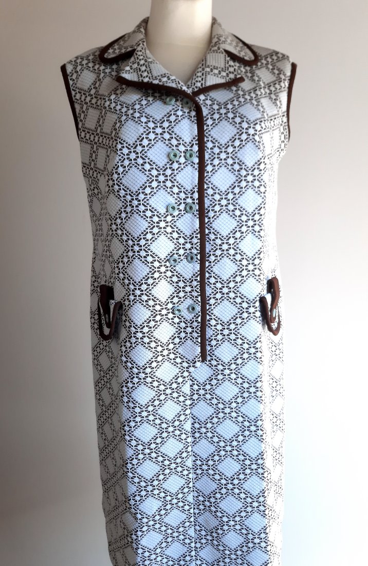 sukienka vintage z lat 60/70-tych w kolorze jasnoszarym i brązowym, bez rękawów, z kołnierzykiem, brązowa lamówka, zapinana z przodu do połowy na guziki w kolorze miętowym, dwie klapki imitujące kieszenie, na podszewce, długość za kolano, brak metki z rozmiarem i składem, grubszy materiał charakterystyczny dla tamtych lat