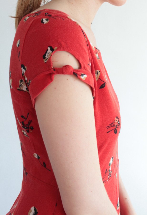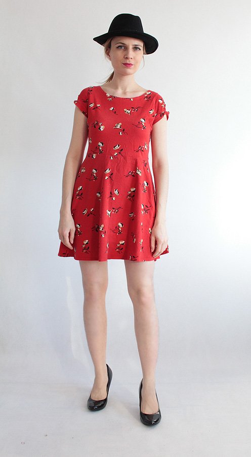 Czerwona sukienka vintage w kwiatowy wzór wykonana z miękkiej, przyjemnej w dotyku, natualnej tkaniny. Sukienka ma fason bardzo sprzyjający sylwetce - dopasowany na górze i lekko rozkloszowany ku dołowi krój optycznie maskuje zbyt szerokie biodra i kreuje figurę klepsydry. Uroku dodaje jej ciekawy detal na rękawach.