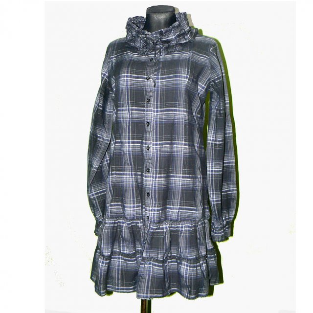 Bawełniana sukienka w kratę w odcieniach grafitu, szarości i ciemnego granatu, zapinana na guziki na całej dlugości. Dół zdobiony falbanami, rękawy zapinane na guziki. Posiada ciekawy duży kołnierz, który można związać na podwójne troczki lub zostawić luźno.