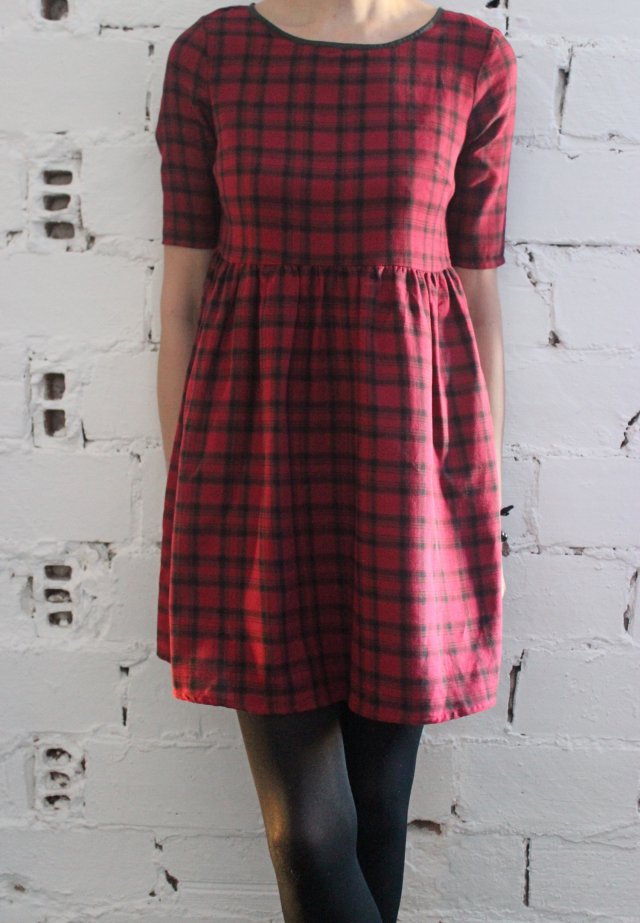 Sukienka w kratę. Rozmiar z metki 38/M. Wymiary: obwód biustu-45cmx2 (mierzony od pachy do pachy), obwód pasa-41cmx2, obwód bioder-71cmx2, długość sukienki-85cm. Brak metki ze składem materiału.