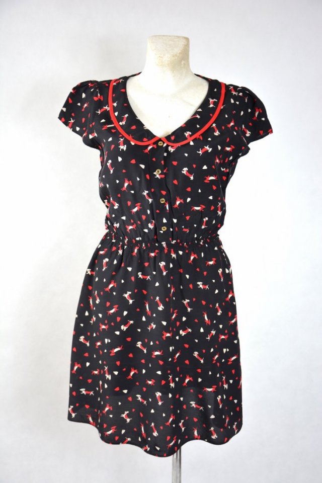 łodka czarna sukienka o poszerzanym kroju w biało-czarne psiaki w towarzystwie serduszek, charakterystyczny kołnierz w styu retro wykończony czerwoną lamówką, z przodu kilka dekoracyjnych guzików, w pasie na gumce, dół mocno poszerzany.