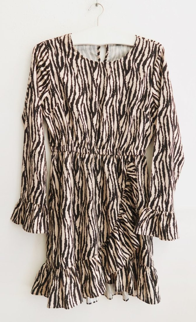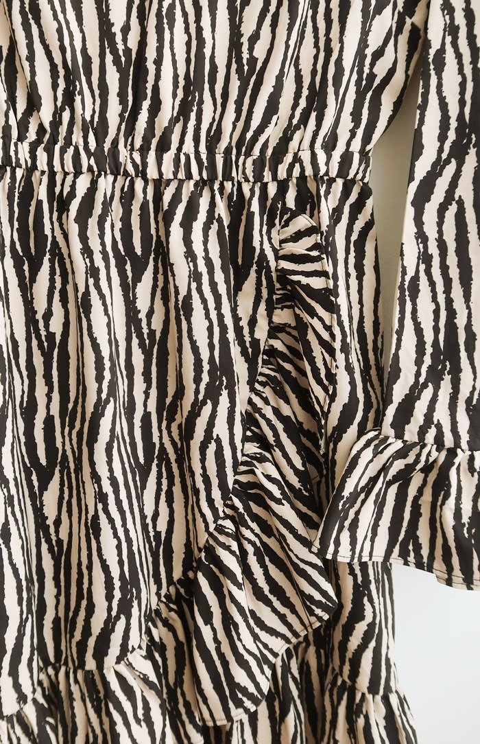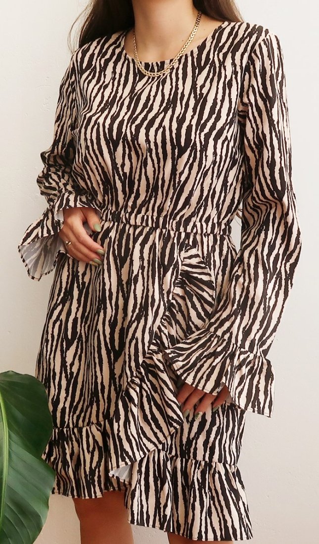 Sukienka w zebrę, wykończona falbanką.