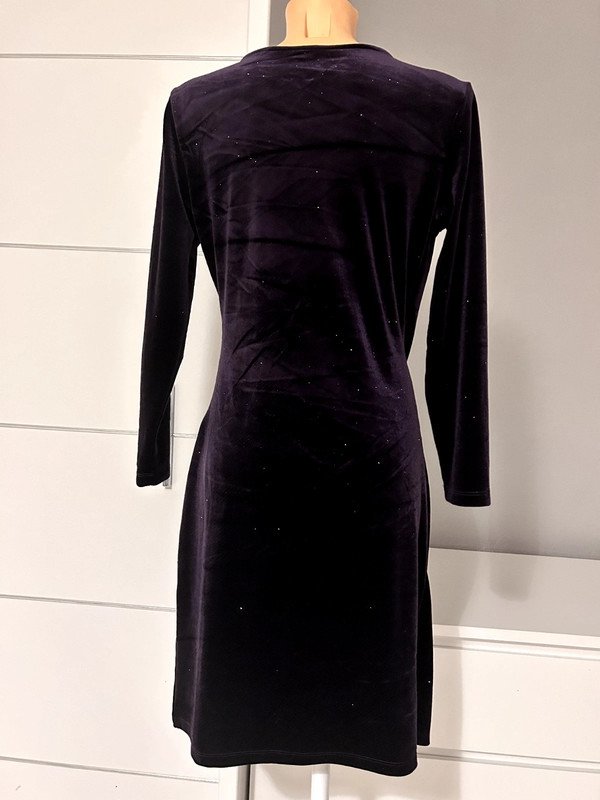 Sukienka welurowa firmy Carla F. rozmiar M 38. Kolor bardzo ciemny fiolet, połyskuje na srebrno. Bardzo kobiecy i klasyczny fason. Dekolt v, asymetryczne marszczenie w okolicy pasa. Idealna na bal, studniówkę, wesele, osiemnastkę i inne imprezy. Wymiary na zdjęciach. Polecam