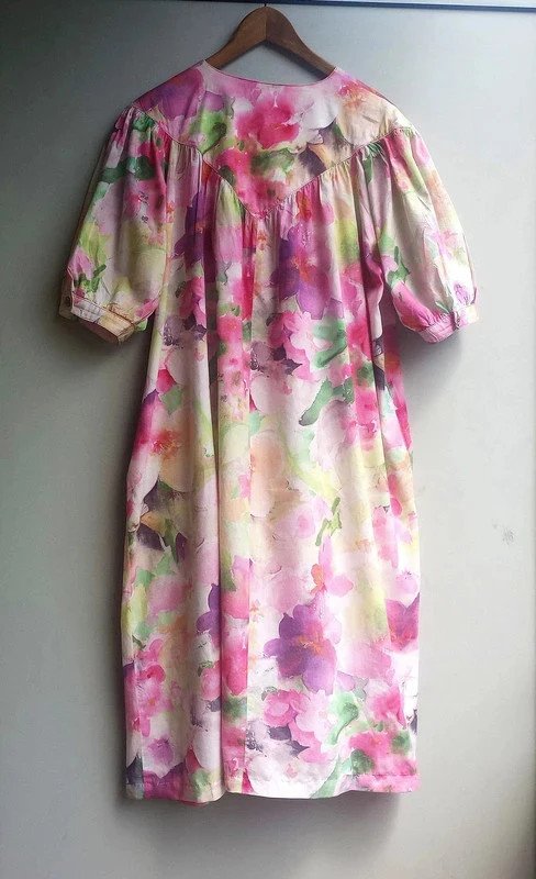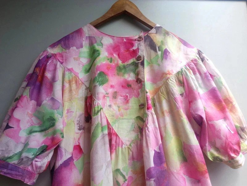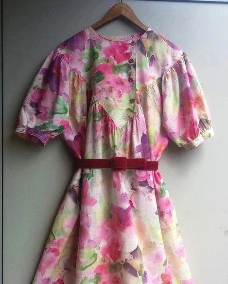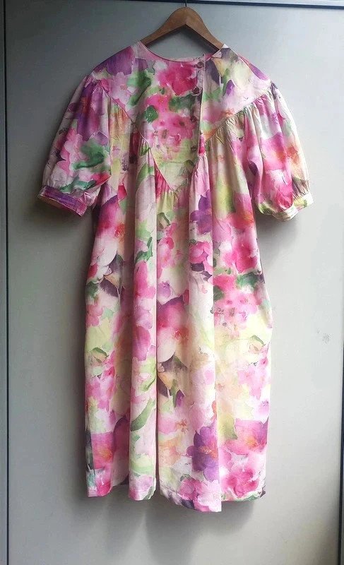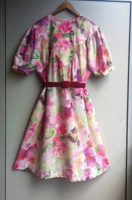 Sukienka true vintage z lat 80. Krój i kolory mówią same za siebie. Sukienka cudownie poszerza ramiona - właśnie w stylu lat 80. Karczek jest z przodu zapinany na guziki. Po odpięciu tworzy się klapa. Sukienka ma dwie boczne, wewnętrzne kieszenie.