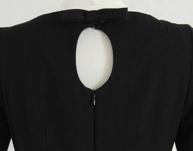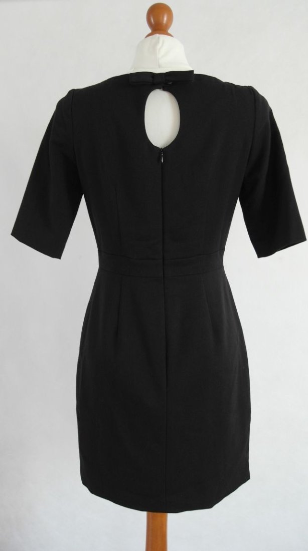czarna, taliowana z zaszewkami.z tyłu długi suwak, ułatwiający wkładanie. na karku okrągłe wycięcie, zapinane na guziczek przykryty wąską kokardką.