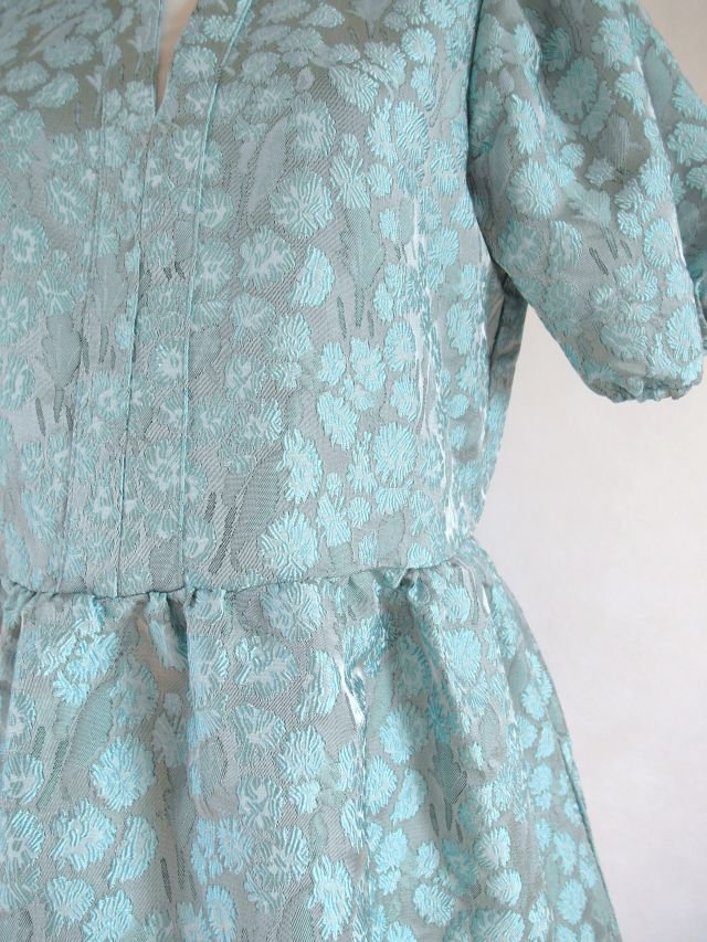 miętowy, mieniący się żakard.rękawy bufki w gumkę, w pasie szczypanki. Fason baby doll, tkanina lekko sztywna, pięknie się prezentuje. Mnie się skojarzyła z lalką z pozytywki :-) Polecam! kolor na zdj. może być bardziej intensywny, na żywo jest bardziej stonowany.