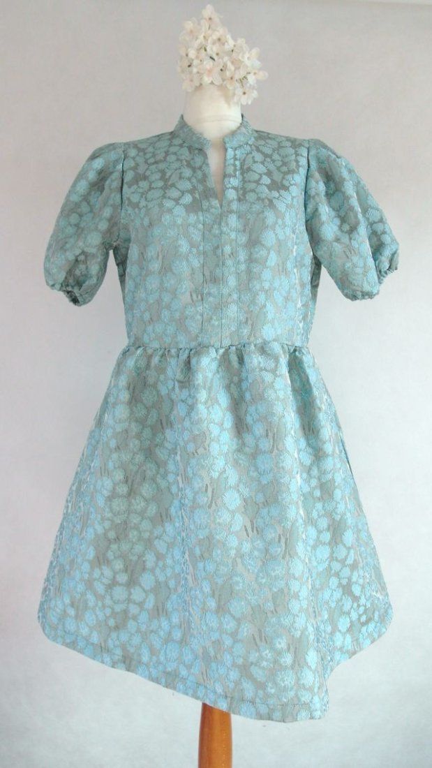 miętowy, mieniący się żakard.rękawy bufki w gumkę, w pasie szczypanki. Fason baby doll, tkanina lekko sztywna, pięknie się prezentuje. Mnie się skojarzyła z lalką z pozytywki :-) Polecam! kolor na zdj. może być bardziej intensywny, na żywo jest bardziej stonowany.