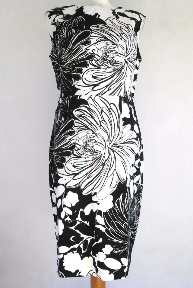 ciekawy wzór-dwa rodzaje kwiatów. Kolor czarno biały.w pasie odcięta, z tyłu długi suwak, u dołu rozcięcie.Lekko elastyczna.Super do kolorowych dodatków. Dobry materiał, trzyma fason. ponadczasowa, zawsze elegancka.