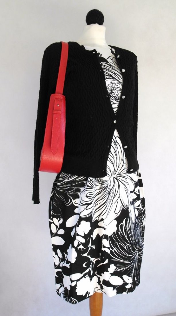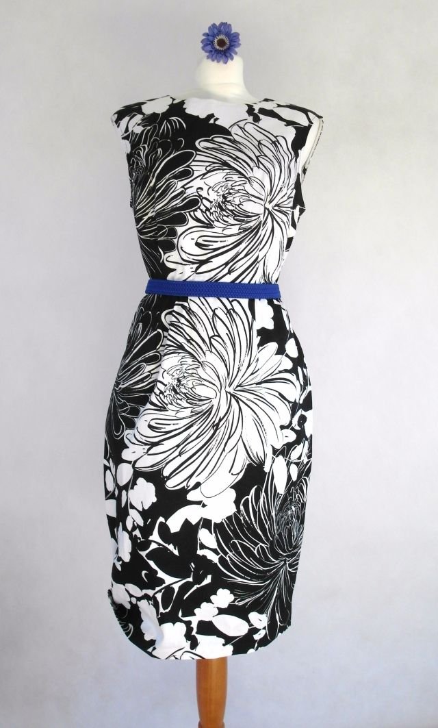 ciekawy wzór-dwa rodzaje kwiatów. Kolor czarno biały.w pasie odcięta, z tyłu długi suwak, u dołu rozcięcie.Lekko elastyczna.Super do kolorowych dodatków. Dobry materiał, trzyma fason. ponadczasowa, zawsze elegancka.