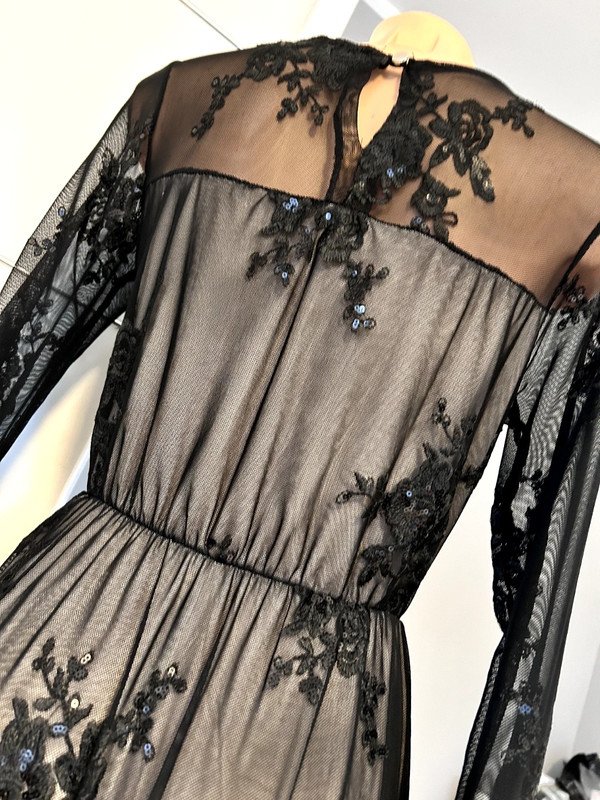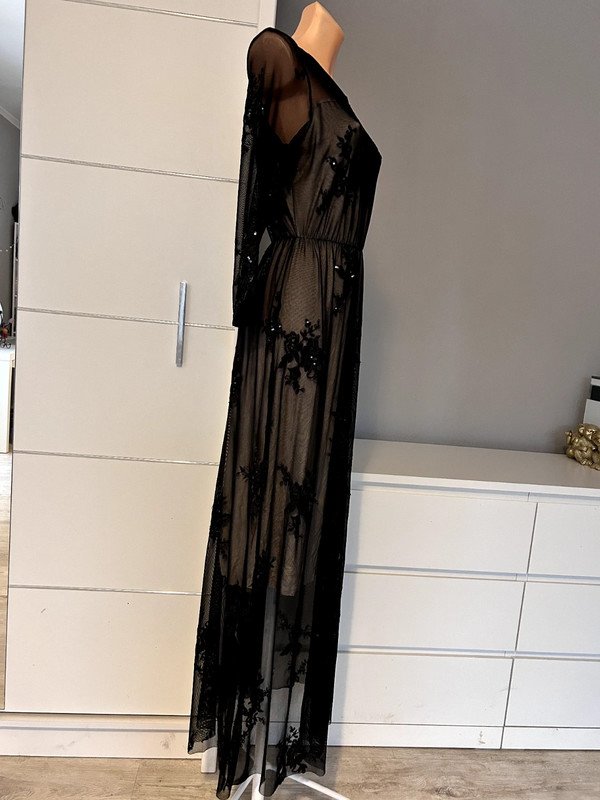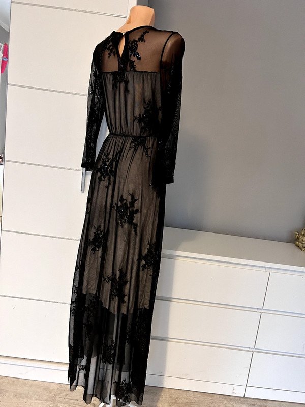 Suknia sukienka maxi długa, z koronki. Nie posiada metki z rozmiarem, określam go jako S/M, ale proszę sugerować się wymiarami na zdjęciach. Idealna na bal, studniówkę, wesele, imprezę. Posiada jasną kremową podszewkę i haftowane czarne kwiaty zdobione cekinami. Polecam