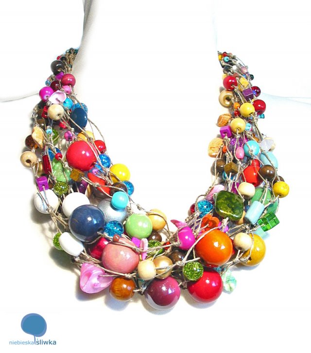Wyjątkowy naszyjnik pełen pozytywnej energii. Wykonany na kilkudziesięciu sznureczkach przędzy lnianej z wielobarwnych korali i minerałów. W splocie znalazły się; korale szklane, crackle, masa perłowa, muszle, akryl, szklane perełki, drewno i garść minerałów. Długość naszyjnika mierzona po zapięciu ok. 54 cm. Zapięcie posrebrzane.