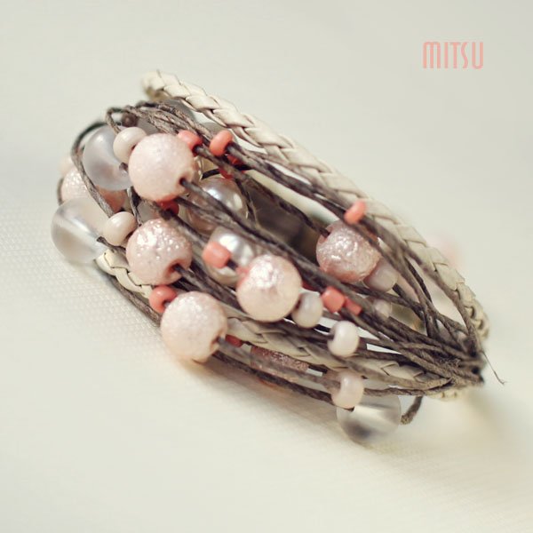Bransoleta w przepięknej, romantycznej gamie, pudrowego różu, beżu, ecru i ciepłego koralu. Zbudowana z gniecionej perły szklanej w odciniu różowym, koralików łososiowych i beżowych , perły lśniącej białej oraz matowych zmrożonych szklanych kul. Całość osadzona na lnianej przędzy, ozdobiona plecionymi ekologicznymi rzemieniami w kolorze ecru. Zakończenia w kolorze starego złota. Rozmiar: 19-21 cm