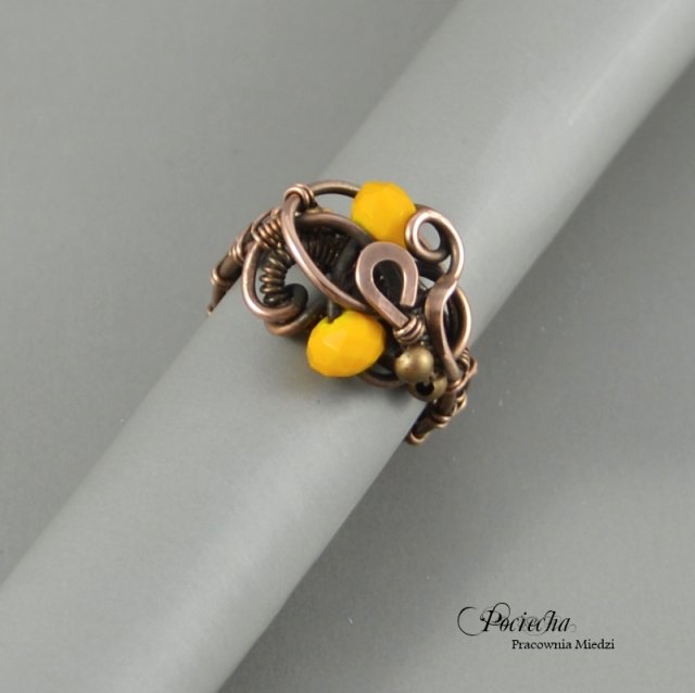 Pierścionek stworzony ręcznie z miedzi jubilerskiej, ozdobiony szklanymi kryształkami w kolorze pięknej żółci oraz miedzianymi kuleczkami. Pierścionek ma uniwersalny rozmiar, bardzo wygodny w noszeniu. Patynowany na antyczny kolor i ręcznie polerowany. Wymiary części ozdobnej pierścionka to ok. 2,9 x 1,6 cm. Szerokość obrączki to ok. 6 mm. Projekt autorski.