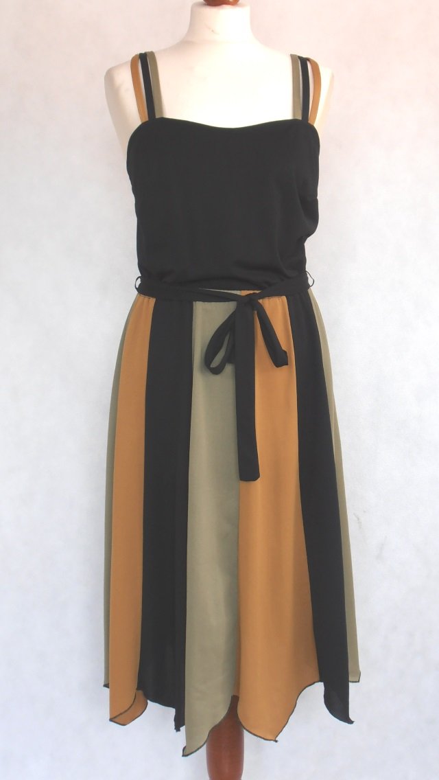 Sukienka firmy sunflair.Rozmiar 40.Materiał polyester.Odcięta w pasie z tunelem z gumką+pasek do wiązania.Góra czarna z trzema ramiączkami w różnych kolorach.Dół z klinów w kolorze czarnym,oliwkowym i orzechowym.Dół trójkątny.Stan bardzo dobry.Długość 111 cm.pod pachami 90 cm.