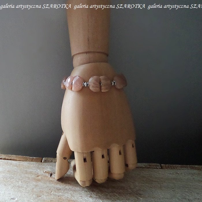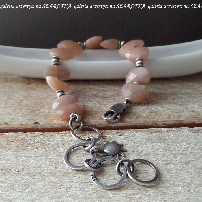 Bransoletka wykonana z beżowo-brzoskwiniowego kamienia słonecznego w postaci fasetowanych półksiężyców wielkości ok. 13-15 x 7-12 x 4-5 mm i oksydowanego srebra pr. 925, w tym zawieszka w kształcie jednostronnie wypukłego słoneczka o średnicy 11 mm. Długość regulowana - max. 23 cm. Kamienie posiadają drobne, naturalne spękania