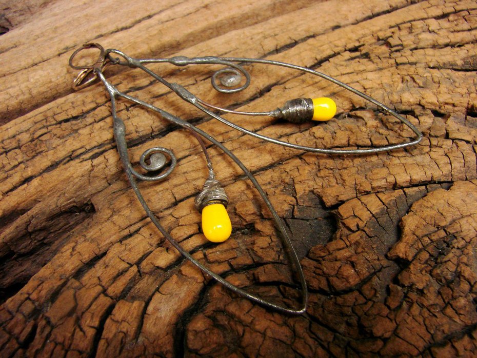 Kolczyki wykonane ręcznie ze szklanych słoneczno - żółtych kropelek i miedzi lutowane przy użyciu stopu cyny i srebra . Kołczyki stylizowane na stare srebro i ręcznie polerowane. Długość wraz z biglem ok 10 cm - zawieszone na angielskich biglach. Zapraszam do zakupu..