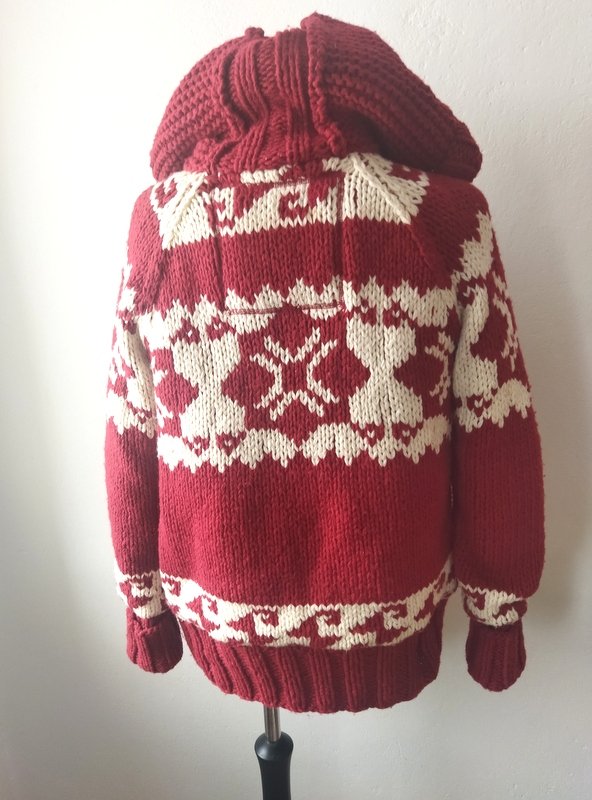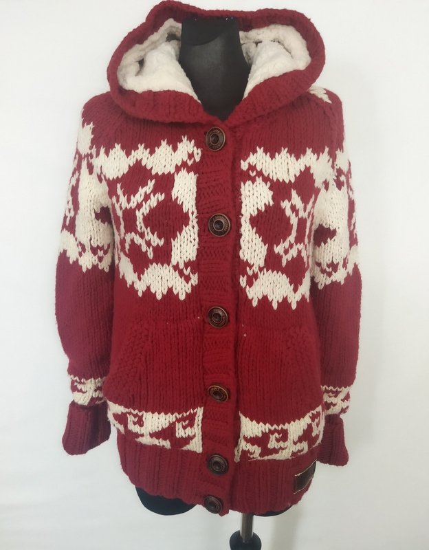 Ciepła dzianinowa kurtka z grubej akrylowej włóczki z domieszką wełny i poliamidu w kolorze jarzębinowej czerwieni w białe wzory, od środka na sztucznym misiu. Zapinana na sygnowane guziki. Z kapturem , z raglanowymi rękawami, z dwiema wpuszczanymi kieszeniami. Wykończona ściągaczami.