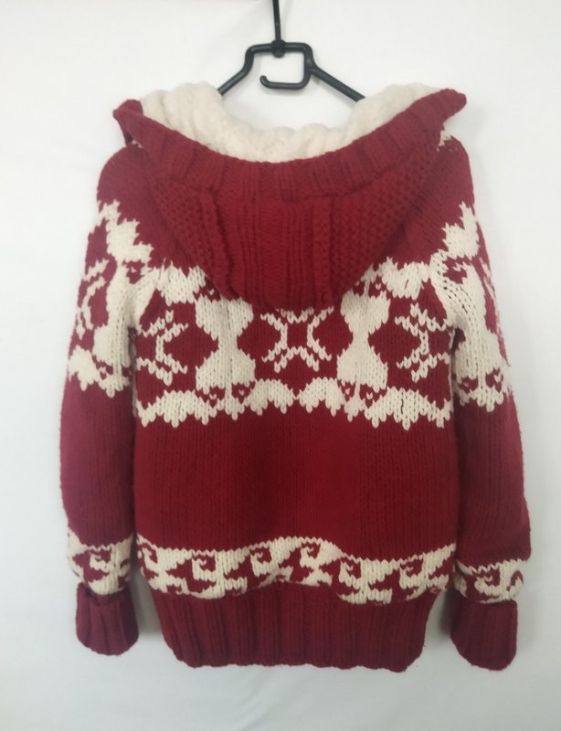 Ciepła dzianinowa kurtka z grubej akrylowej włóczki z domieszką wełny i poliamidu w kolorze jarzębinowej czerwieni w białe wzory, od środka na sztucznym misiu. Zapinana na sygnowane guziki. Z kapturem , z raglanowymi rękawami, z dwiema wpuszczanymi kieszeniami. Wykończona ściągaczami.