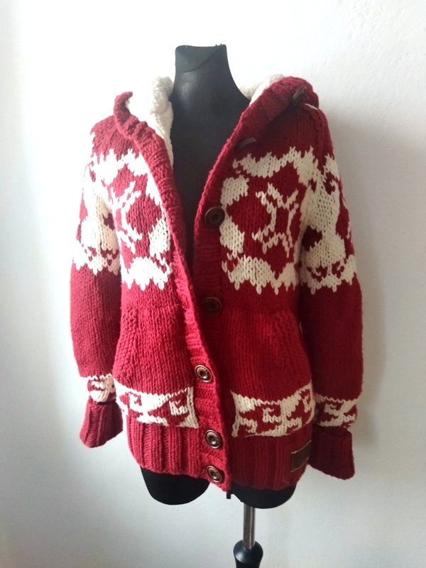 Ciepła dzianinowa kurtka z grubej akrylowej włóczki z domieszką wełny i poliamidu w kolorze jarzębinowej czerwieni w białe wzory, od środka na sztucznym misiu. Zapinana na sygnowane guziki. Z kapturem , z raglanowymi rękawami, z dwiema wpuszczanymi kieszeniami. Wykończona ściągaczami.