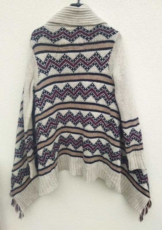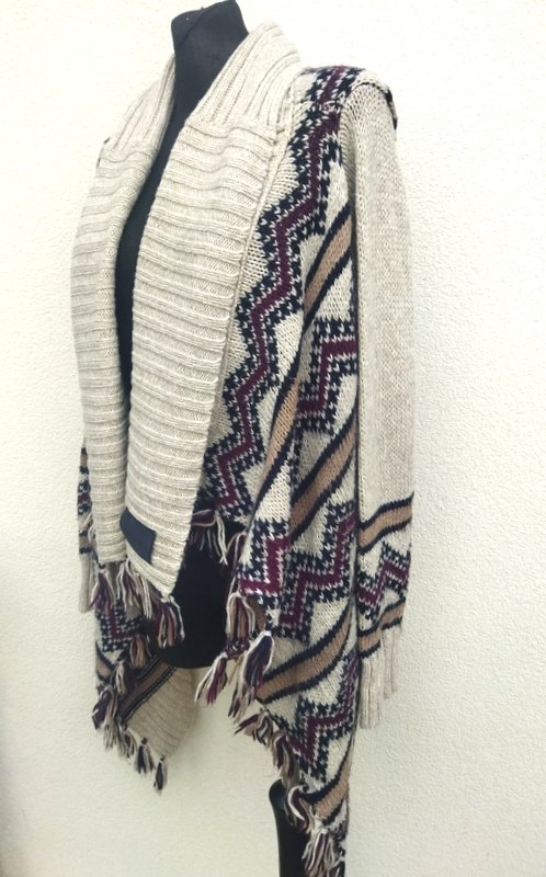 Ciepły wzorzysty sweter z akrylowej włóczki z wełną i nylonem w kolorystyce odcieni beżu, czerni i kasztanowego brązu. Fason otwarty z połami przodu głęboko na siebie zachodzącymi aż do przeciwległego boku wykończonymi chwostami , które można dowolnie formować. Wykończony ściagaczami.