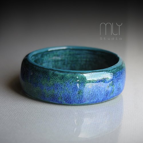 Efektowna, lekko nieregularna, ceramiczna bransoletka ręcznie wykonana najwyższej jakości porcelany, barwionej niejednorodnie na odcienie morskiej zieleni, szkliwiona mieszanką błękitnych i zielonych szkliw z efektem plamek Średnica wewnętrzna około 6,5cm, szerokość około 2,5cm, grubość około 8mm. Wykonywana na zamówienie - czas realizacji około 10-14dniPolecam