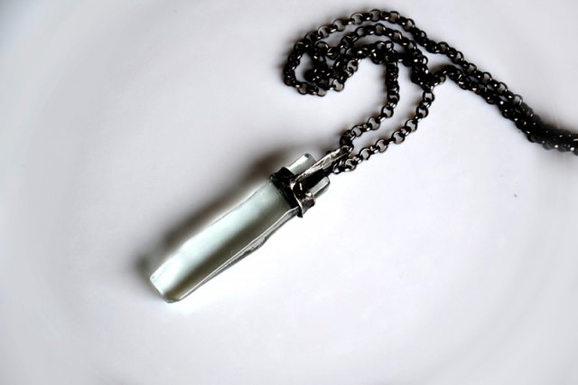 Rustykalny naszyjnik ze stapianym transparentnym szkłem. Wymiary szkła to ok. 5,5 x 1,2 cm. Oprawa wisiora i długi łańcuch w kolorze starego srebra. Biżuteria w 100% wykonana ręcznie, poszczególne sztuki mogą się minimalnie różnić.