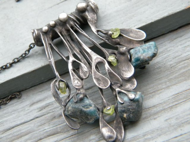 Naszyjnik z surowych apatytów i oliwinów w ocynowanej miedzi. wymiary zawieszki5,9cm x 4,7cm. łańcuszek z posrebrzanej, oksydowanej miedzi z zapięciem z oksydowanego srebra o długości 49cm