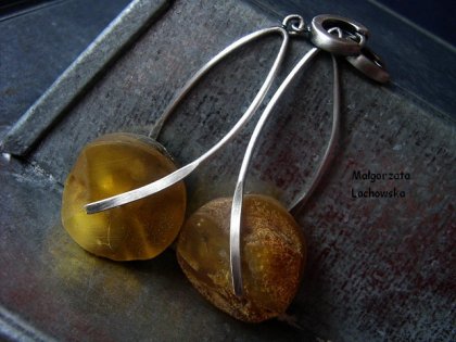Oryginalne , piekne kolczyki wykonane z oksydowanego srebra próby 925 oraz kręgów bursztyny bałtyckiego wielkości około 20x10 mm. Długość kolczyków wynosi 6,4 cm.