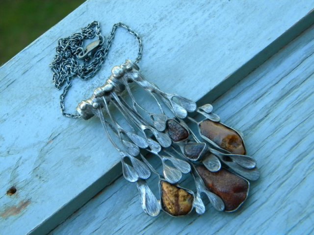 Naszyjnik z surowych bursztynów w ocynowanej miedzi. wymiary zawieszki 7,3cm x 4,8cm. łańcuszek z posrebrzanej, oksydowanej miedzi z zapięciem z oksydowanego srebra o długości 49cm