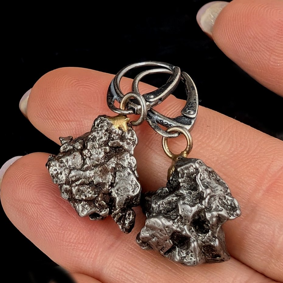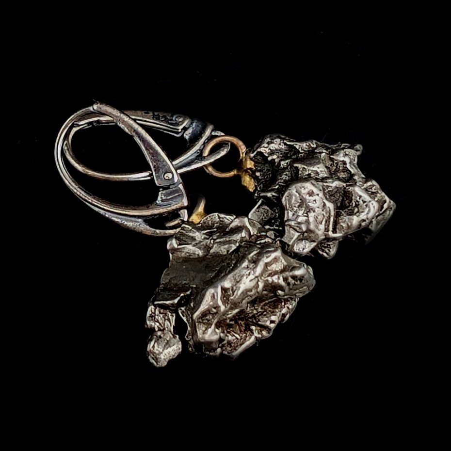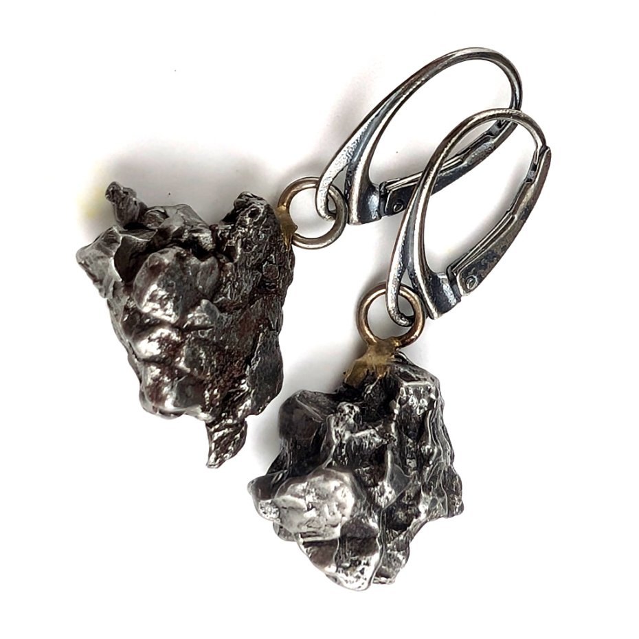 Kosmiczne kolczyki z meteorytami Campo Del Cielo (Argentyna) o kształcie nieregularnych bryłek na biglach angielskich z oksydowanego srebra próby 925. Wymiary elementów 15 x 14 mm. Długość z biglami angielskimi 35 mm. Lekkie, komfortowe i bardzo efektowne. Waga jednego kolczyka 5,7 grama. Kolczyki zostaną wysłane w ozdobnym pudełeczku.