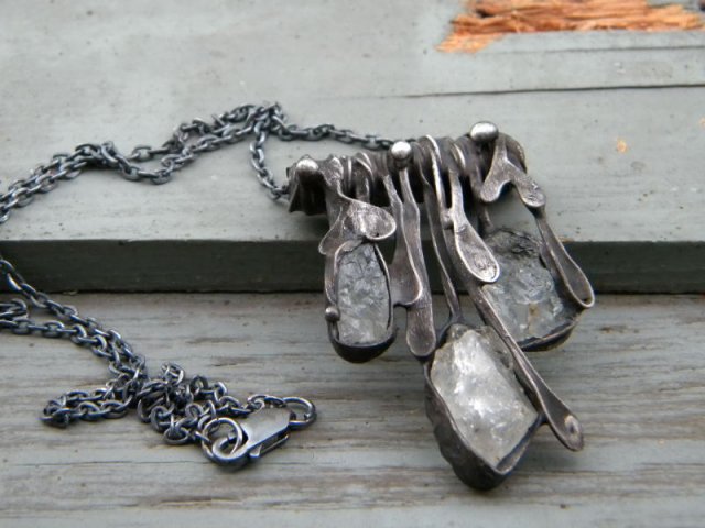 Naszyjnik z surowych topazów w ocynowanej miedzi. wymiary zawieszki 5cm x 3,3cm. łańcuszek z posrebrzanej, oksydowanej miedzi z zapięciem z oksydowanego srebra o długości 49cm