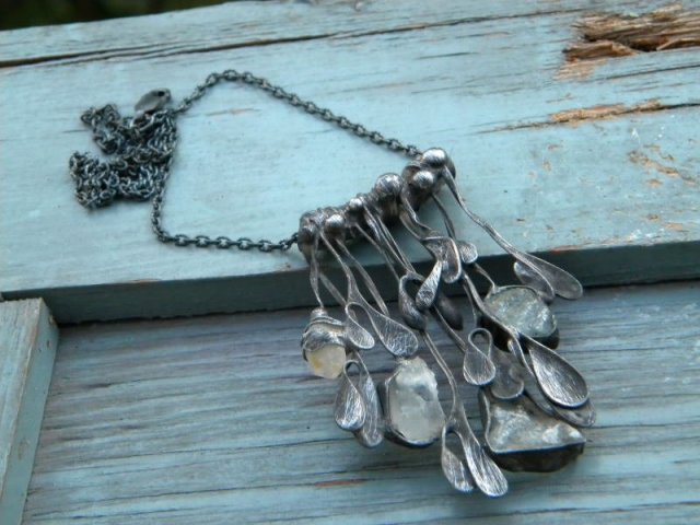 Naszyjnik z surowych topazów w ocynowanej miedzi. wymiary zawieszki 6,7cm x 4,9cm. łańcuszek z posrebrzanej, oksydowanej miedzi z zapięciem z oksydowanego srebra o długości 49cm