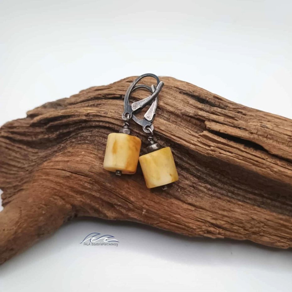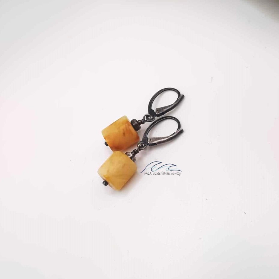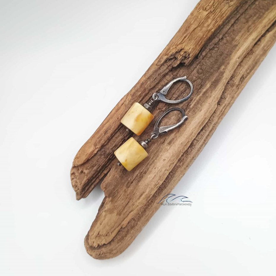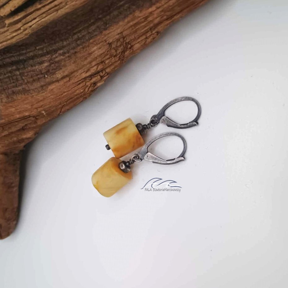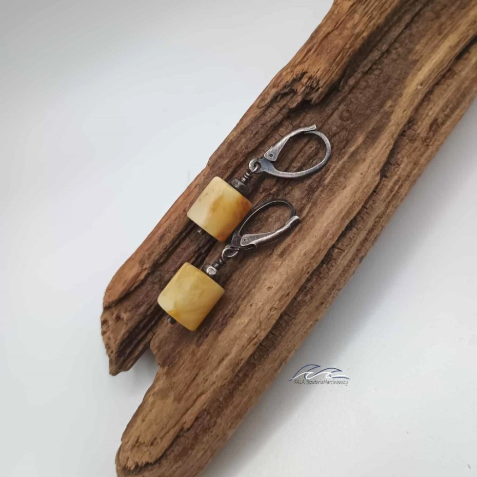 Kolczyki wykonane ręcznie ze srebra pr. 925, oraz wałeczków mlecznego bursztynu.