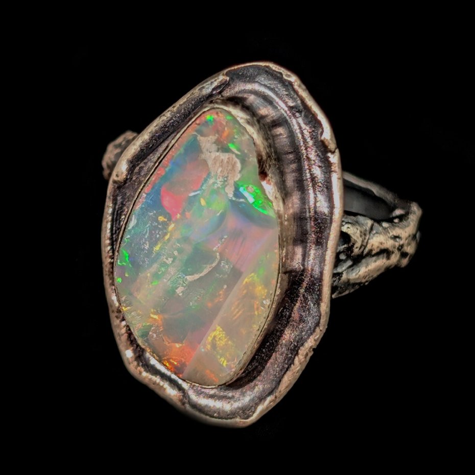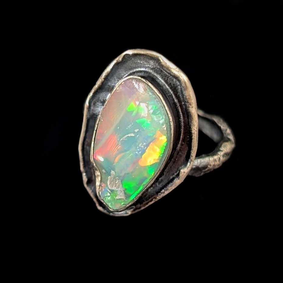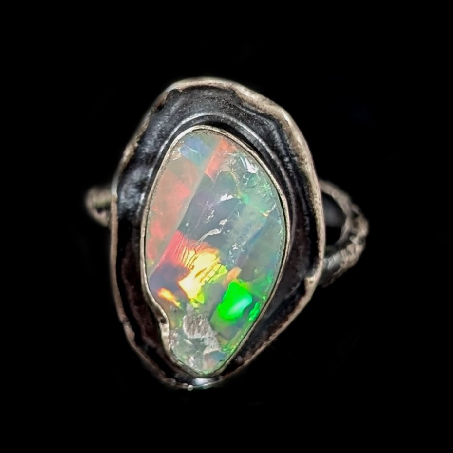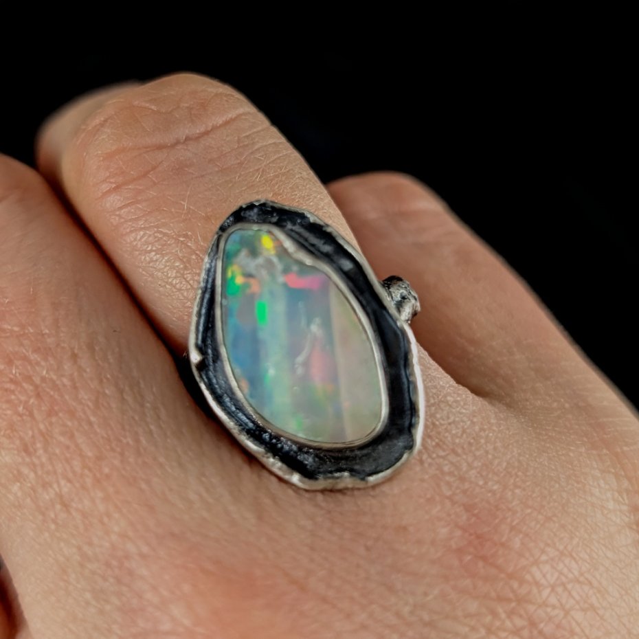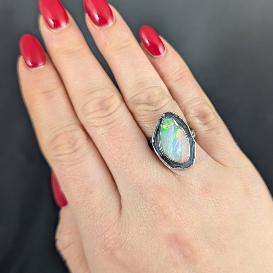 Pierścionek wykonany ze srebra próby 925, oksydowane, przetarte, fakturowane. Rozmiar pierścionka dzięki otwartej podstawie regulowany, dopasuję na dowolny rozmiar w zakresie 9-23. Ozdobą pierścionka jest multibarwny opal z Etiopii, który pięknie opalizuje. Wymiary oprawy kamienia 22 x 16 mm. Szerokość maksymalna obrączki 6 mm, min. 4 mm. Waga 6.88 g. Pierścień zostanie zapakowany w ozdobne pudełeczko.