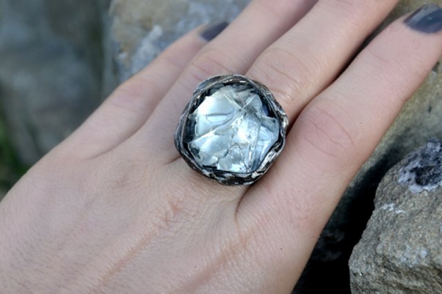 Bardzo efektowny pierścień ze stapianym szkłem. Średnica szkła wraz ze stylizowaną na stare srebro oprawą wykonaną z ekologicznej bezołowiowej cyny to ok. 2,5 cm. Obrączka regulowana.