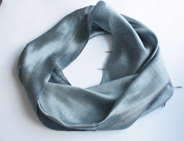 Szal o surowej, niejednolitej strukturze w głębokim, nietypowym odcieniu szarości z kroplą niebieskiego. Wykonany prawdopodobnie z jedwabiu.
