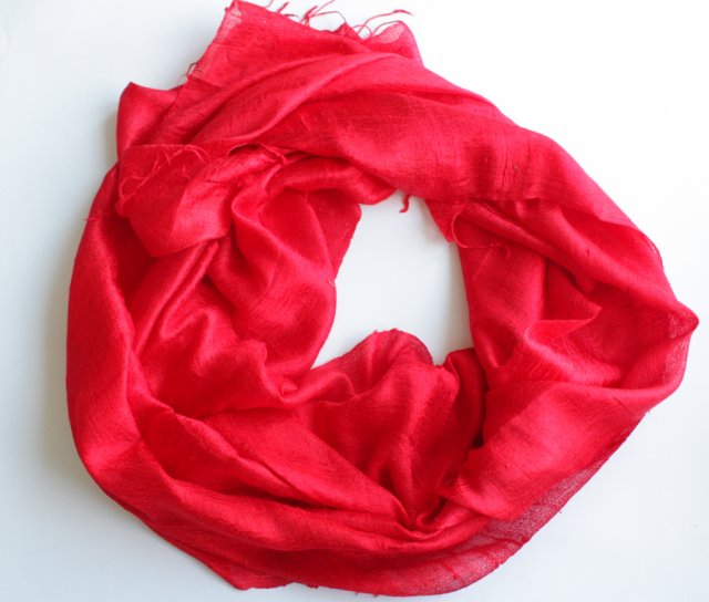 Szal o surowej, niejednolitej strukturze w głębokim odcieniu czerwieni. Wykonany prawdopodobnie z jedwabiu.