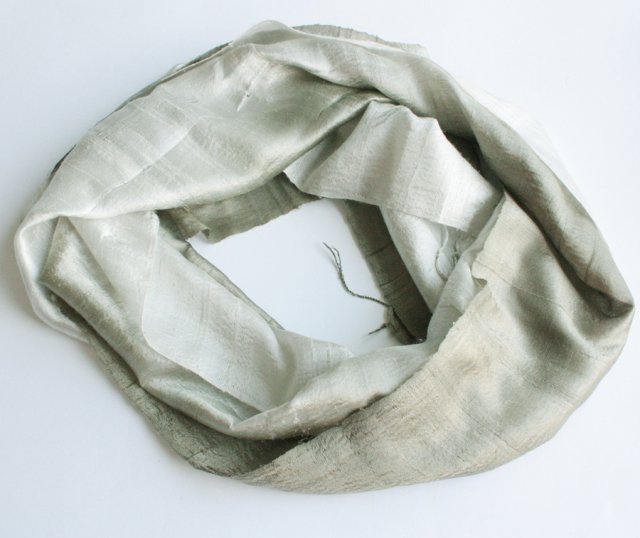 Piękny szal w przelewanych odcieniach (od jasnego popielatego po jasną, zgniłą zieleń) wykonany z tkaniny o surowej, luźnej, nierównej stukturze. Jest to prawdopodbnie jedwab.