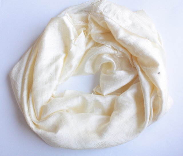 Szal o surowej, niejednolitej strukturze w bardzo jasnym, cytrynowym odcieniu wpadającym w kremowy. Wykonany prawdopodobnie z jedwabiu.
