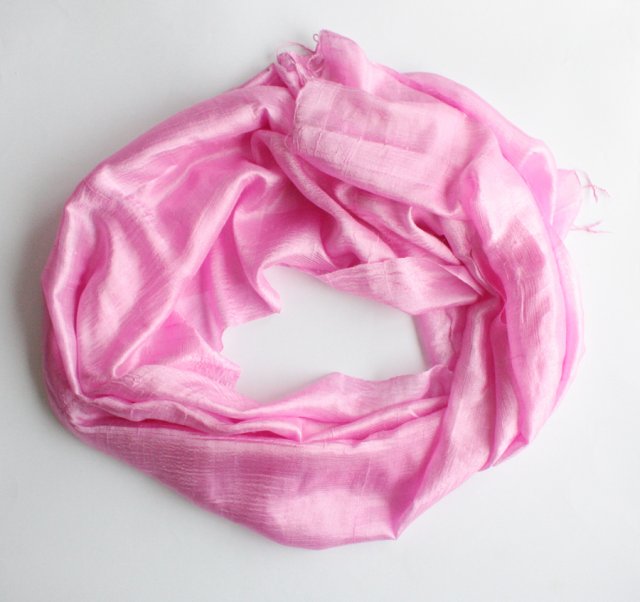 Szal o surowej, niejednolitej strukturze w subtelnym, niezwykle kobiecym odcieniu różu. Wykonany prawdopodobnie z jedwabiu.
