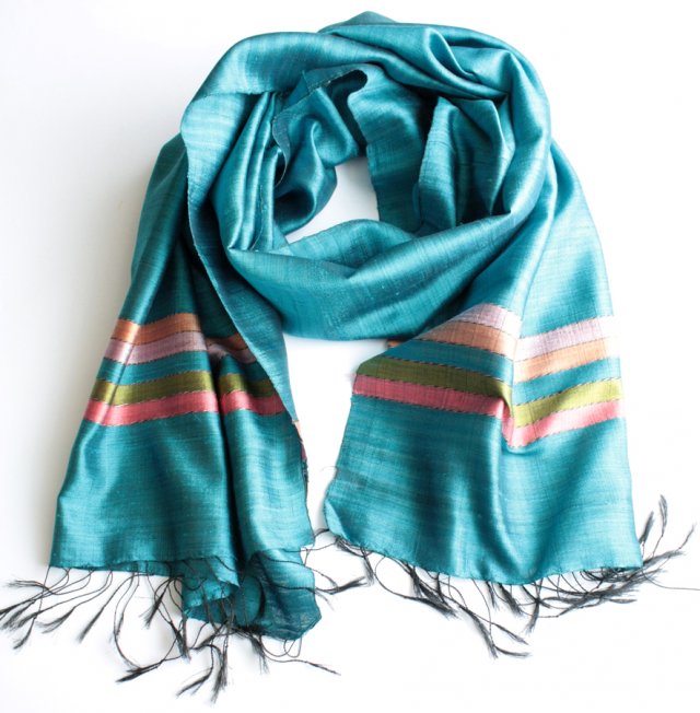 Piękny szal w głębokim odcieniu błękitu, wykończony subtelnymi frędzlami. Materiał przypomina surowy jedwab, ale szal nie ma metki.