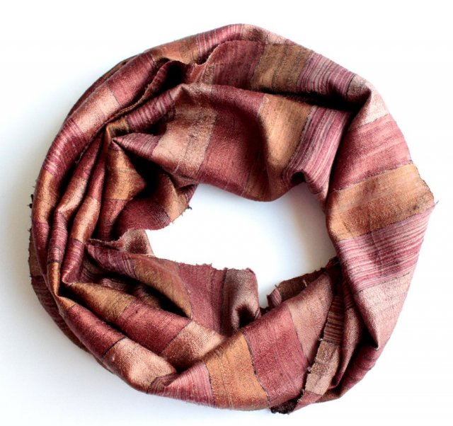 Przepiękny szal w zróżnicowanym, stonowanym odcieniu różu. Wykonany moim zdaniem z jedwabiu o niejednolitej, surowej strukturze.