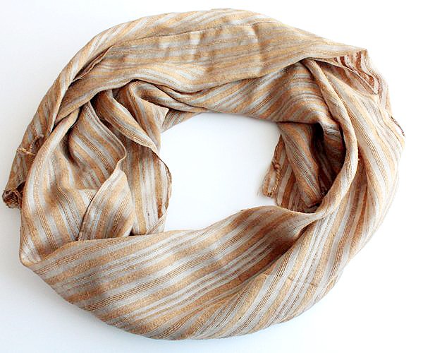 Niezwykły szal wykonany z jedwabiu o surowej, nierównej strukturze. Kolor to złotawy ciemny beż.