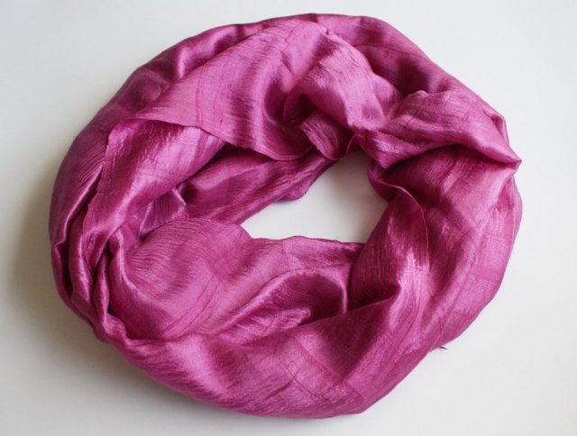 Duży szal w pięknym, głębokim odcieniu biskupim. Materiał to w mojej ocenie surowy jedwab. Struktura tkaniny jest niejednolita, nierówna, nie jest to jednak jej wadą, a stanowi o jej charakterystycznym stylu.