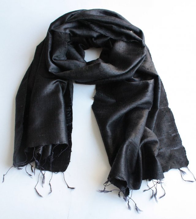 Czarny szal o surowej, niejednolitej strukturze. Materiał to prawdopodobnie jedwab.
