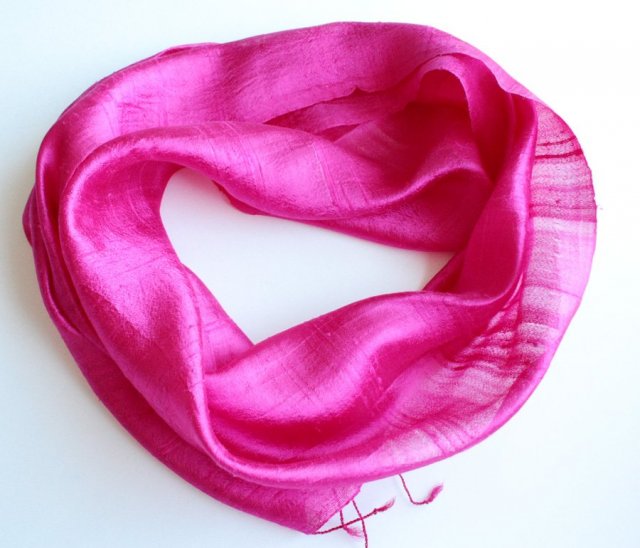 Przepiękny szal w głębokim, bardzo twarzowym odcieniu fuksji. Wykonany moim zdaniem z jedwabiu o niejednolitej, surowej strukturze.