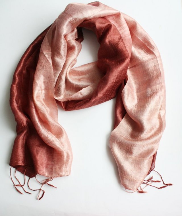 Przepiękny szal w przelewanych kolorach: od jasnego, pudrowego różu do jasnego brązu na granicy bordo. Wykonany moim zdaniem z jedwabiu o niejednolitej, surowej strukturze.