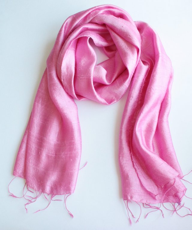 Przepiękny szal w pudrowym odcieniu. Wykonany moim zdaniem z jedwabiu o niejednolitej, surowej strukturze.
