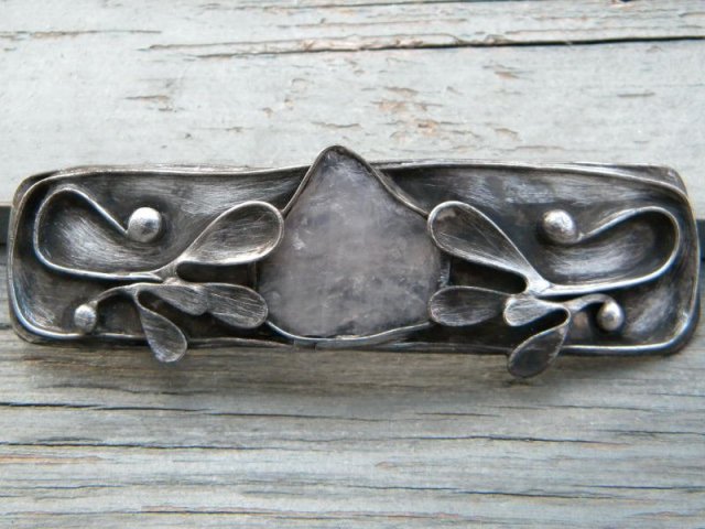 klamra do włosów z surowego kryształu kwarcu różowego oprawionego w ocynowaną miedz.
